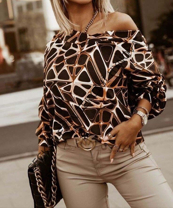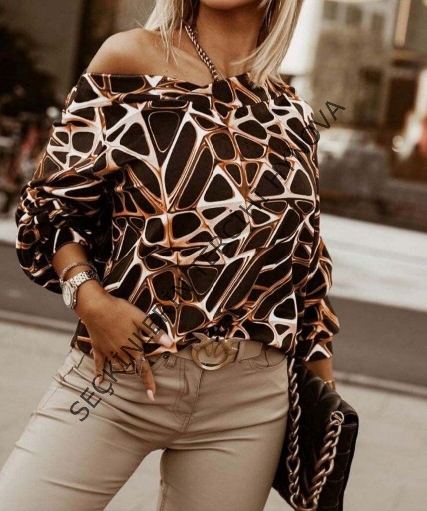 Kadın Uzun Kollu V Yaka Düşük Omuz Geometrik Desen şardonlu Dalgıç Bluz