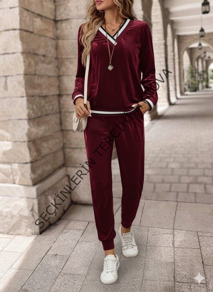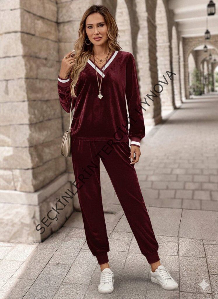 Kadın Uzun Kollu V Yaka Kadife Bluz Ve Pantolon Ikili Takım