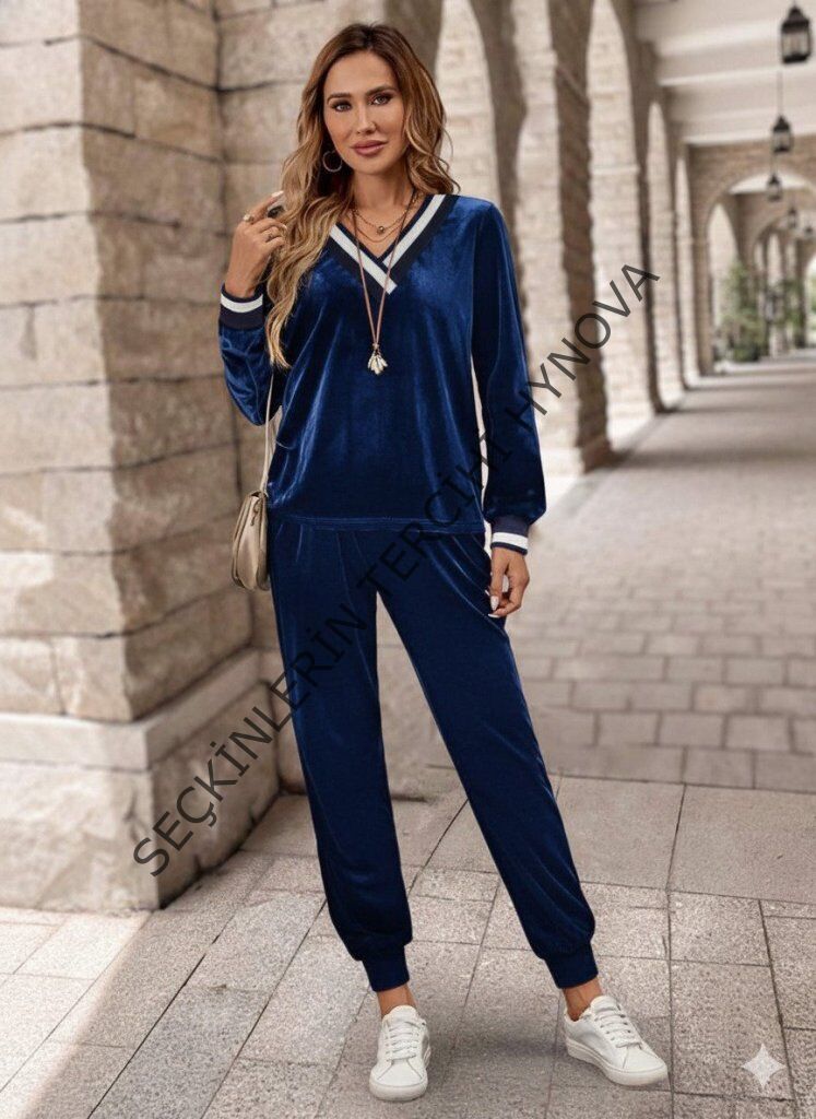 Kadın Uzun Kollu V Yaka Kadife Bluz Ve Pantolon Ikili Takım