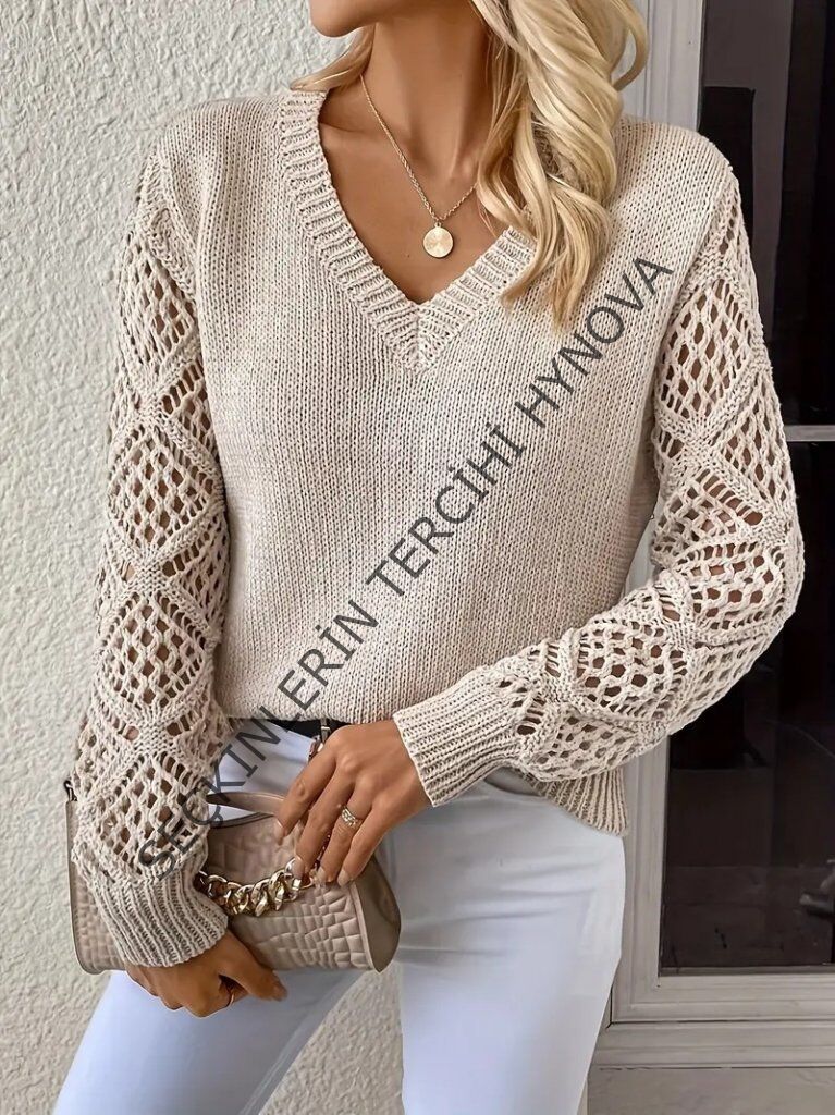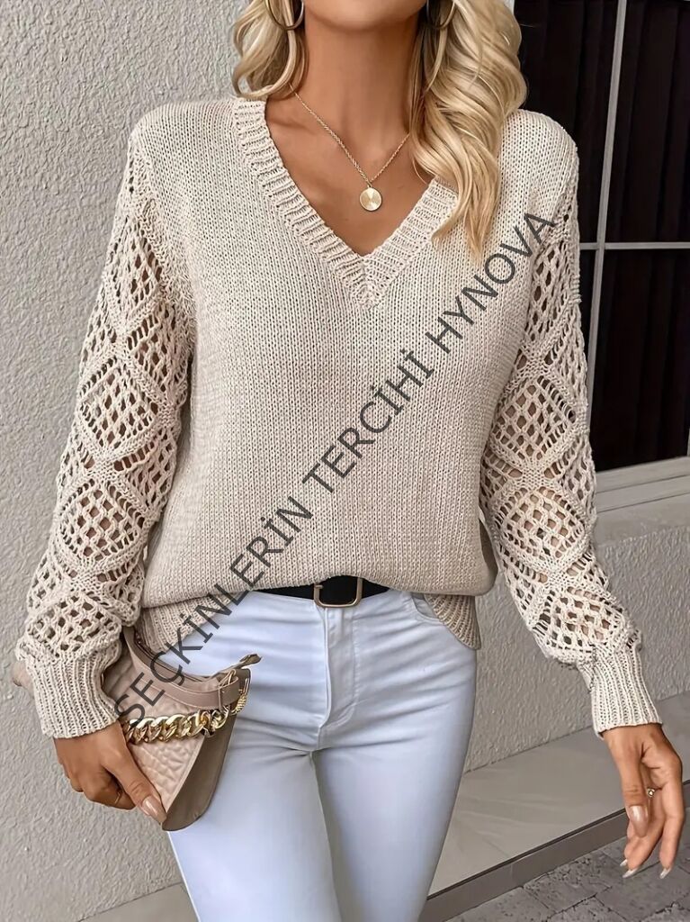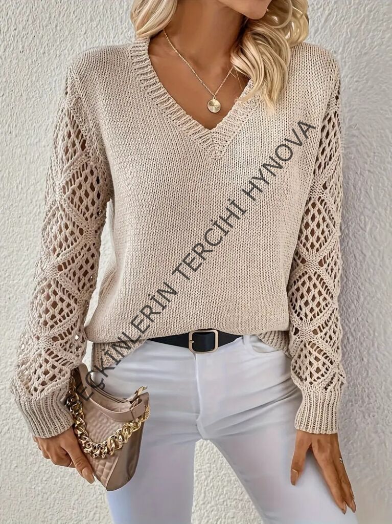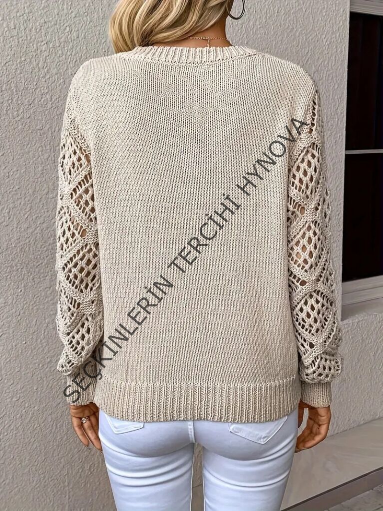 Kadın Uzun Kollu V Yaka Kol Delikli Baklava Desen Detaylı Triko Kazak