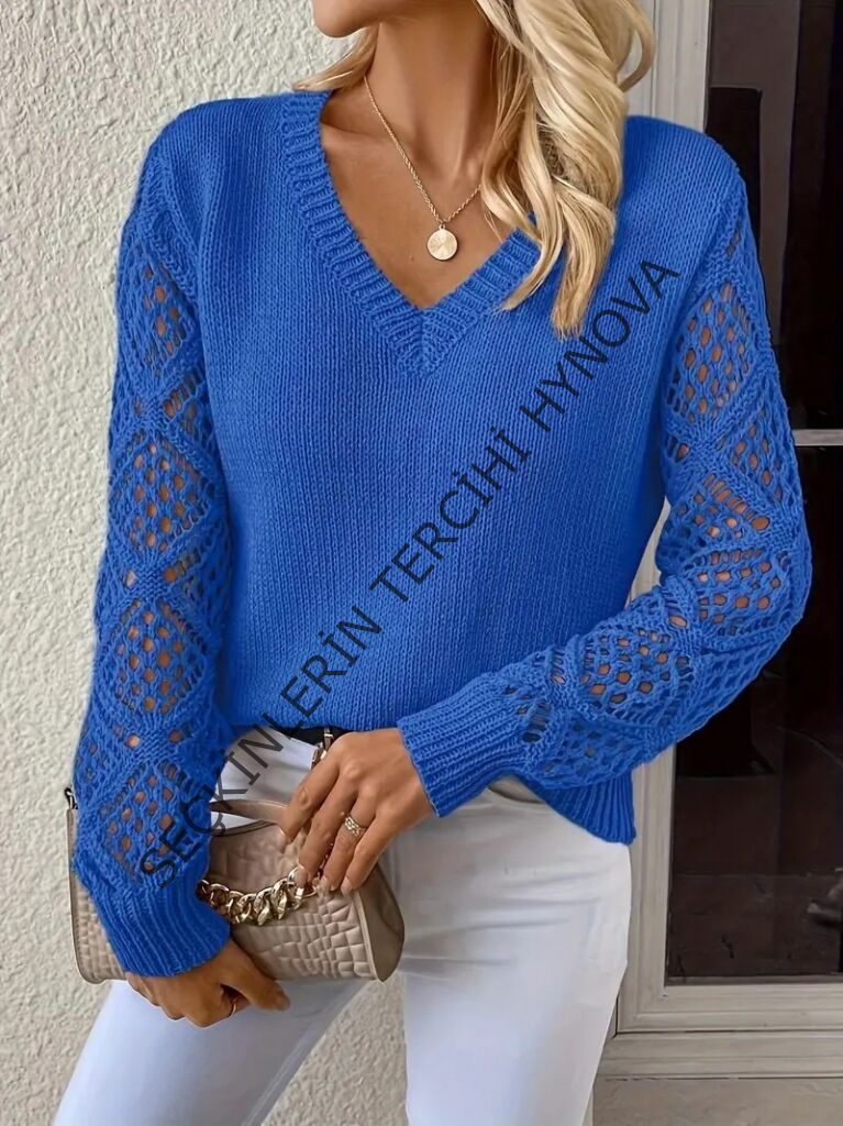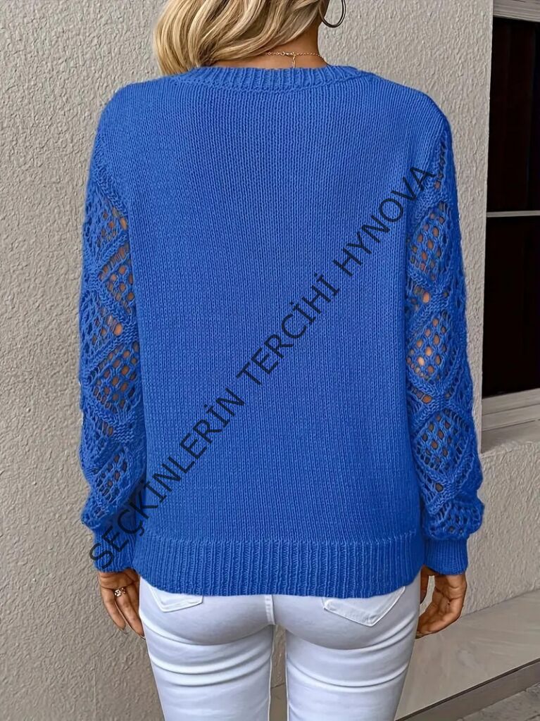 Kadın Uzun Kollu V Yaka Kol Delikli Baklava Desen Detaylı Triko Kazak