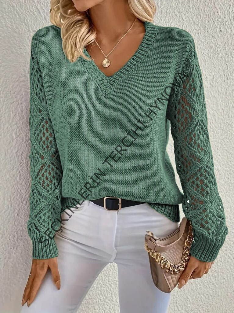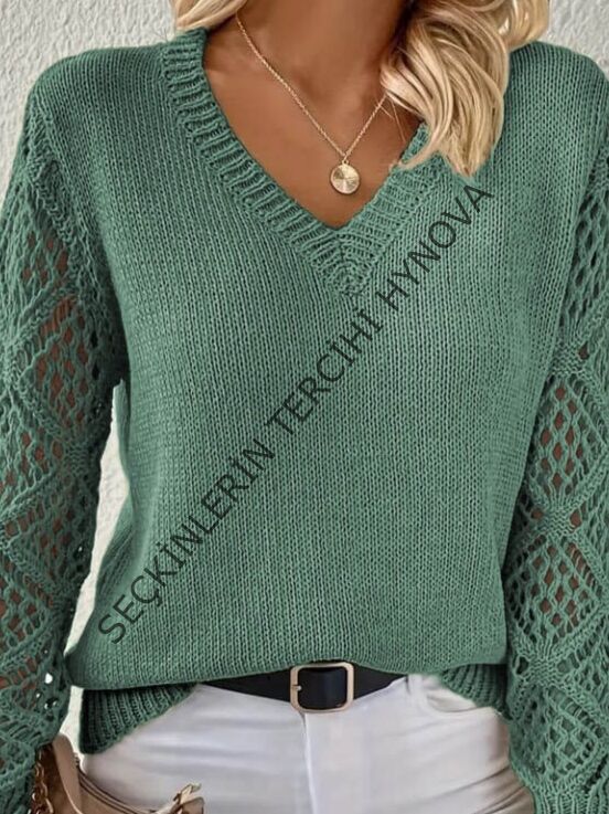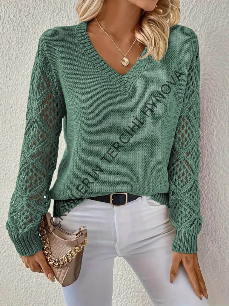 Kadın Uzun Kollu V Yaka Kol Delikli Baklava Desen Detaylı Triko Kazak