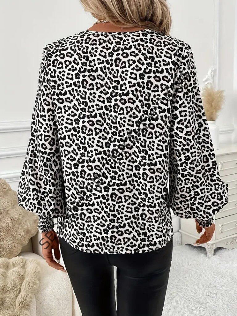 Kadın Uzun Kollu V Yaka Kollar Gipe Detaylı Leopar Desenli Süprem Bluz