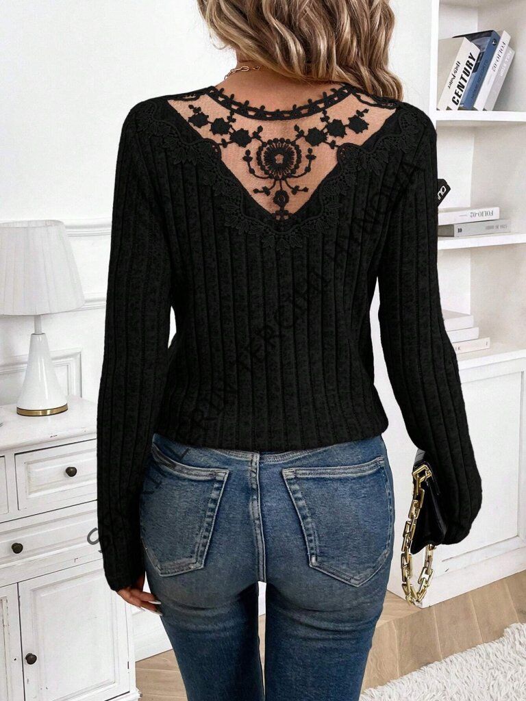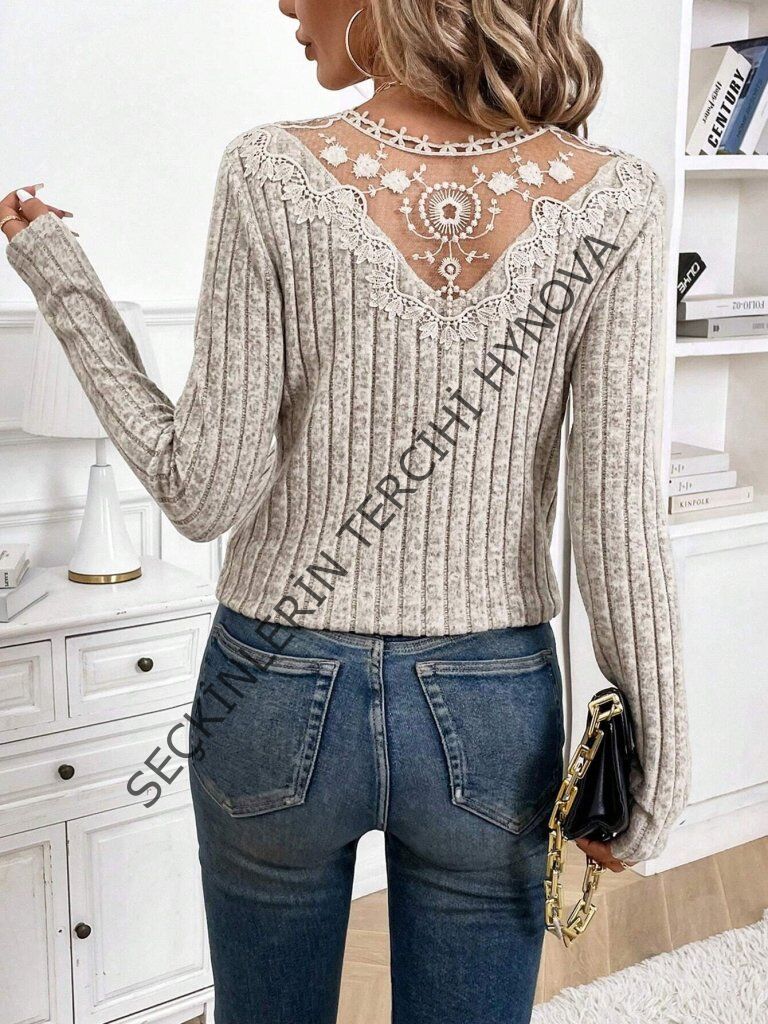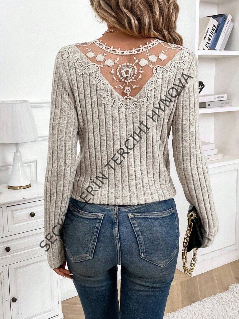 Kadın Uzun Kollu V Yakalı Arkadan Dantel Detaylı şardonlu Kaşkorse Bluz