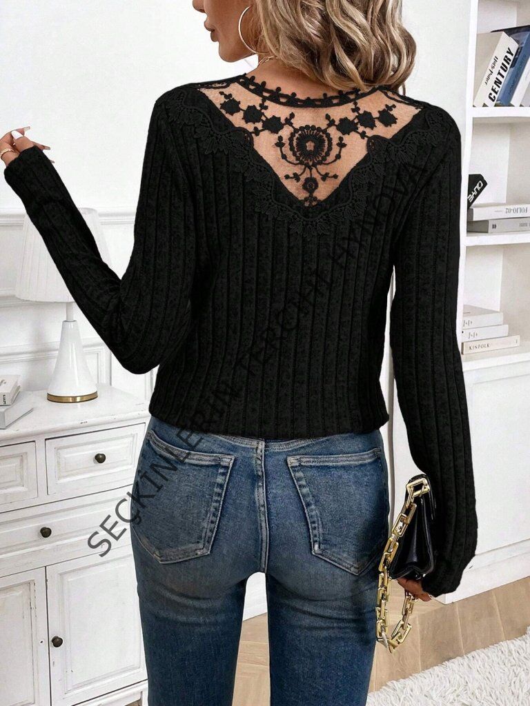 Kadın Uzun Kollu V Yakalı Arkadan Dantel Detaylı şardonlu Kaşkorse Bluz