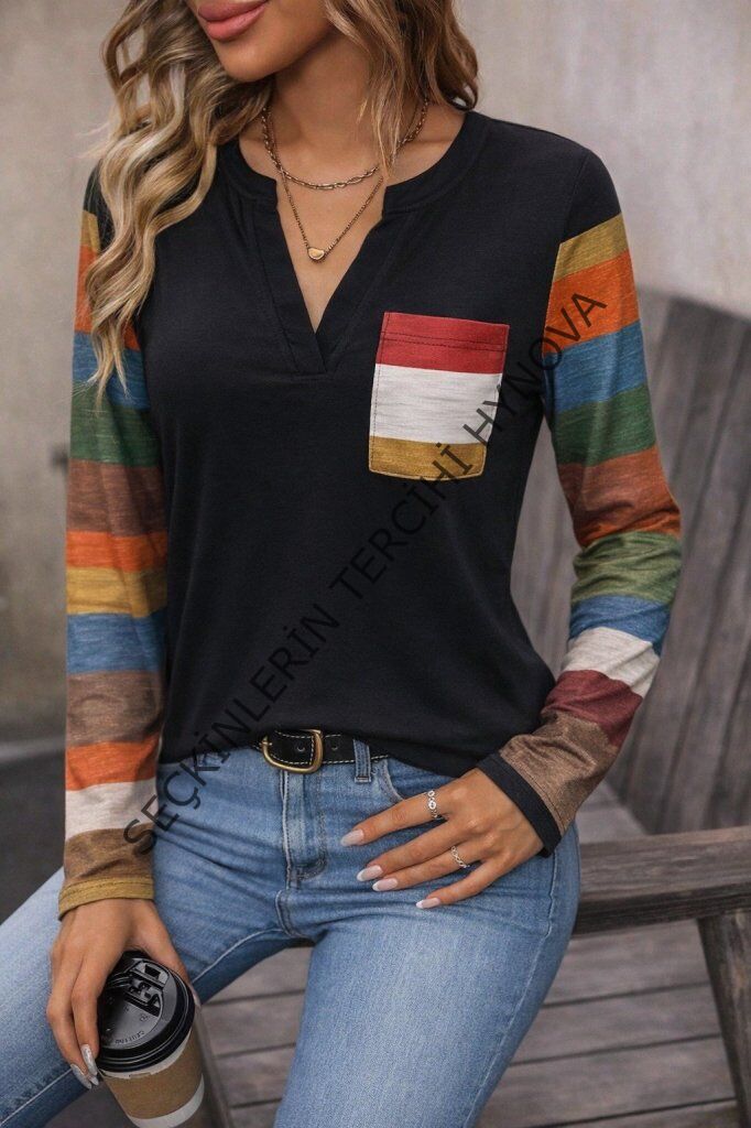 Kadın Uzun Kollu V Yakalı Cepli çok Renkli Viskon Bluz