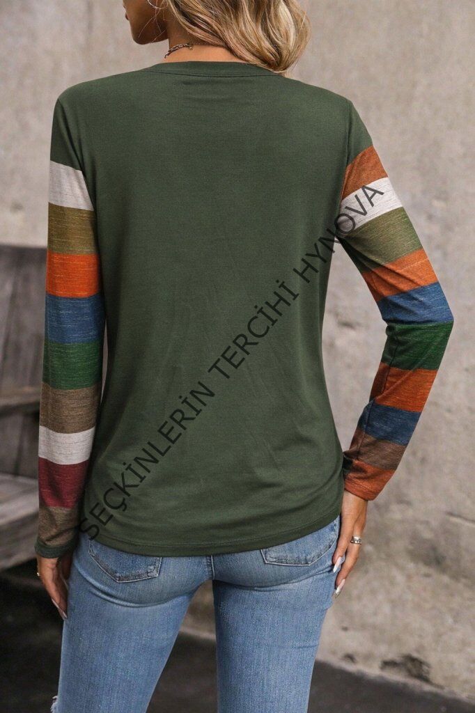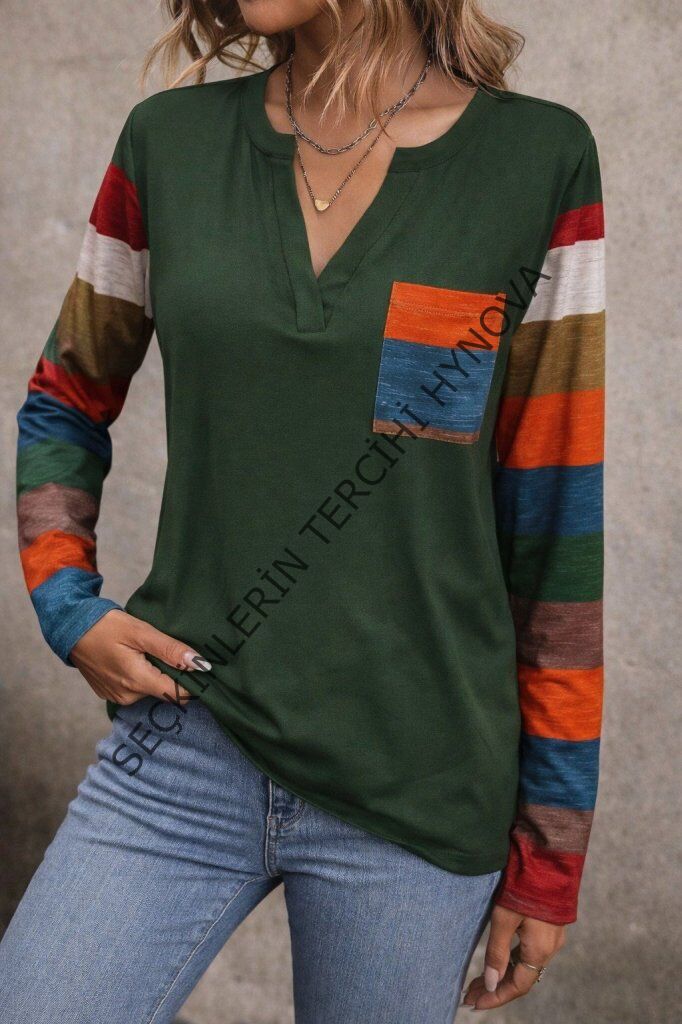 Kadın Uzun Kollu V Yakalı Cepli çok Renkli Viskon Bluz