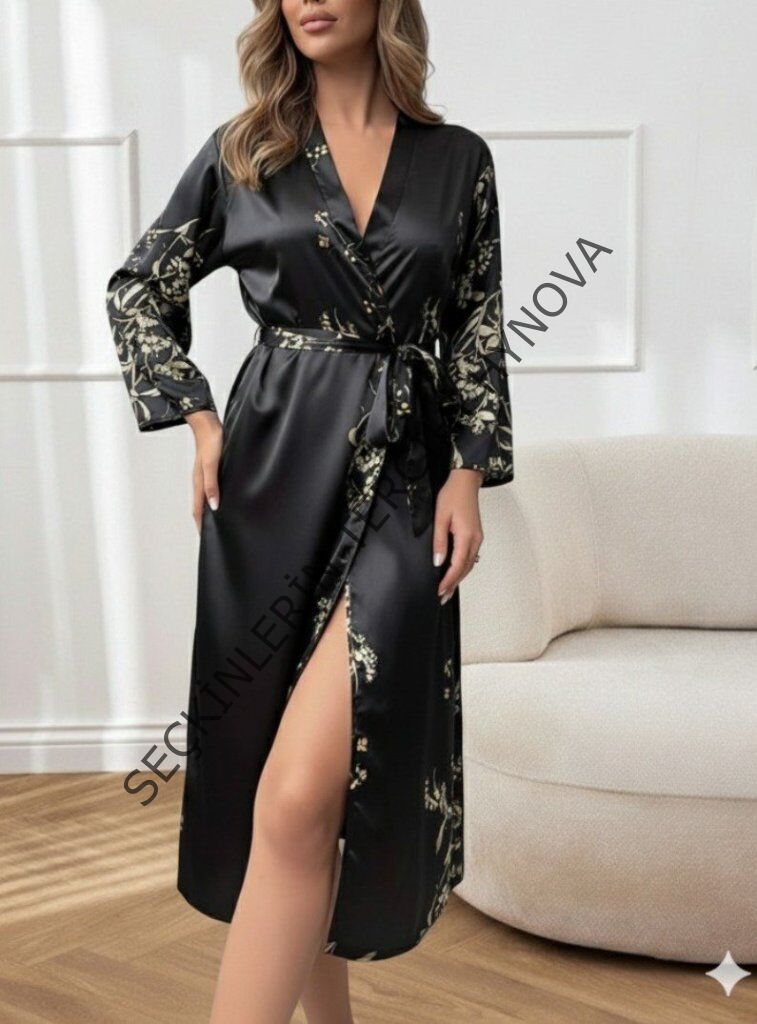 Kadın Uzun Kollu V Yakalı çiçek Baskılı Belden Kuşaklı Midi Saten Gecelik