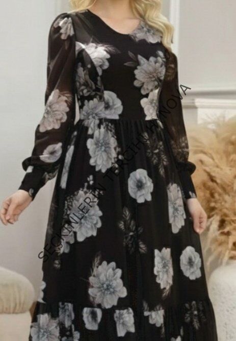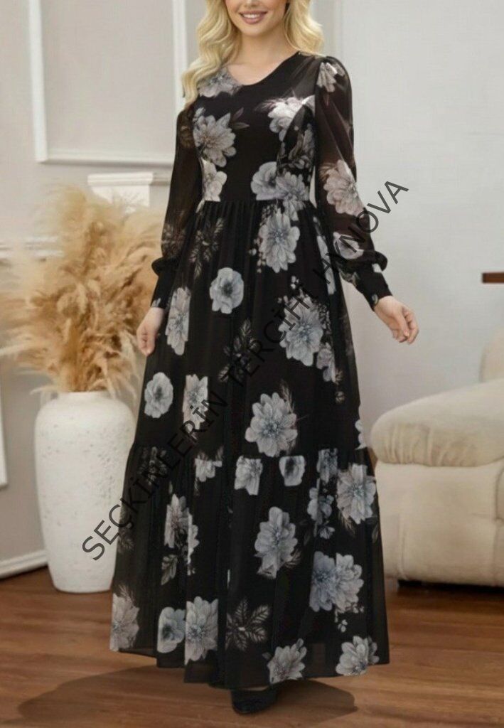 Kadın Uzun Kollu V Yakalı çiçek Desenli Maxi Süprem Elbise