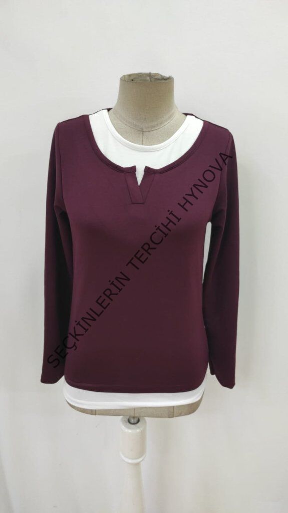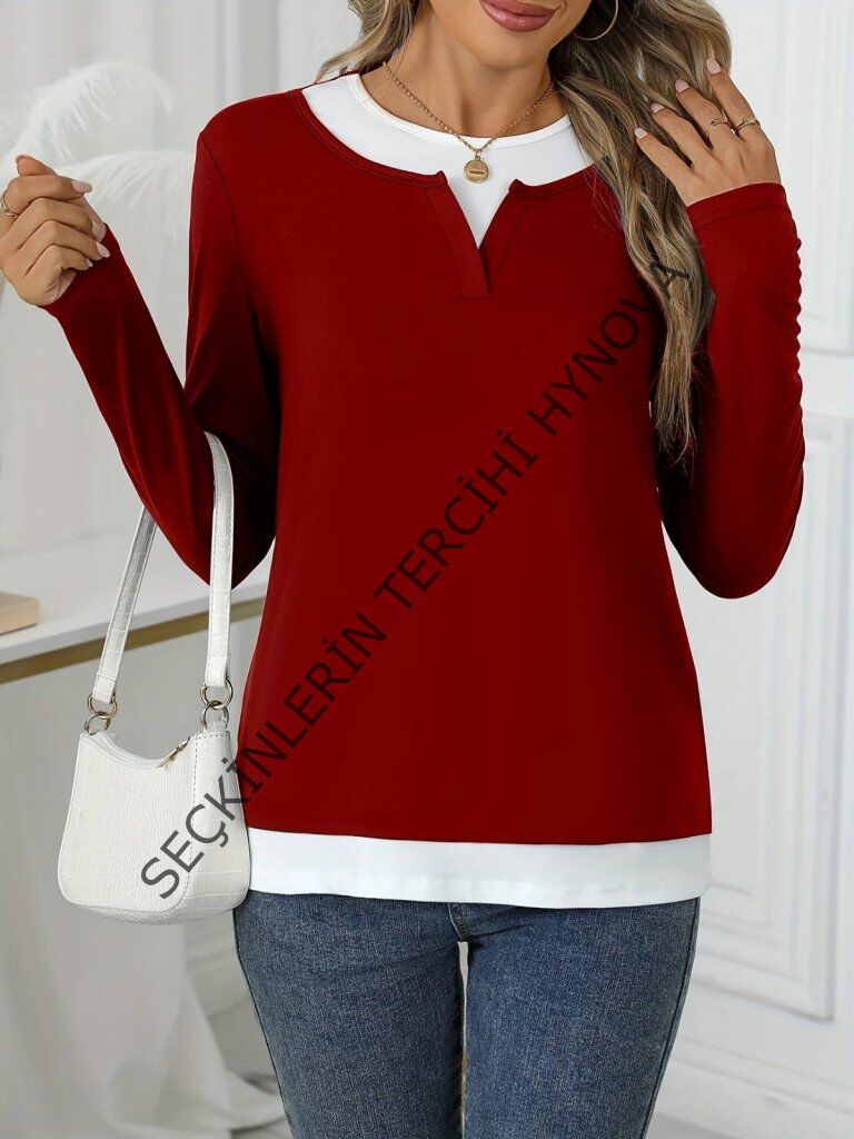 Kadın Uzun Kollu V Yakalı çift Renkli Viskon Iki Iplik Bluz