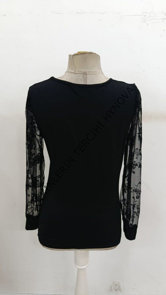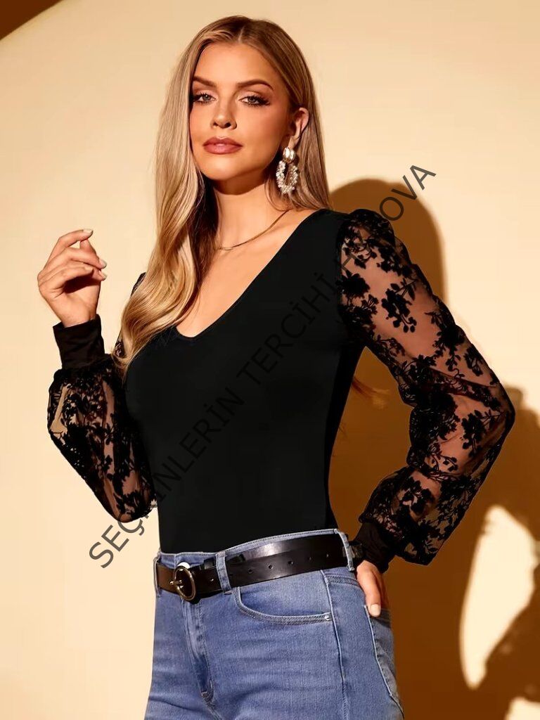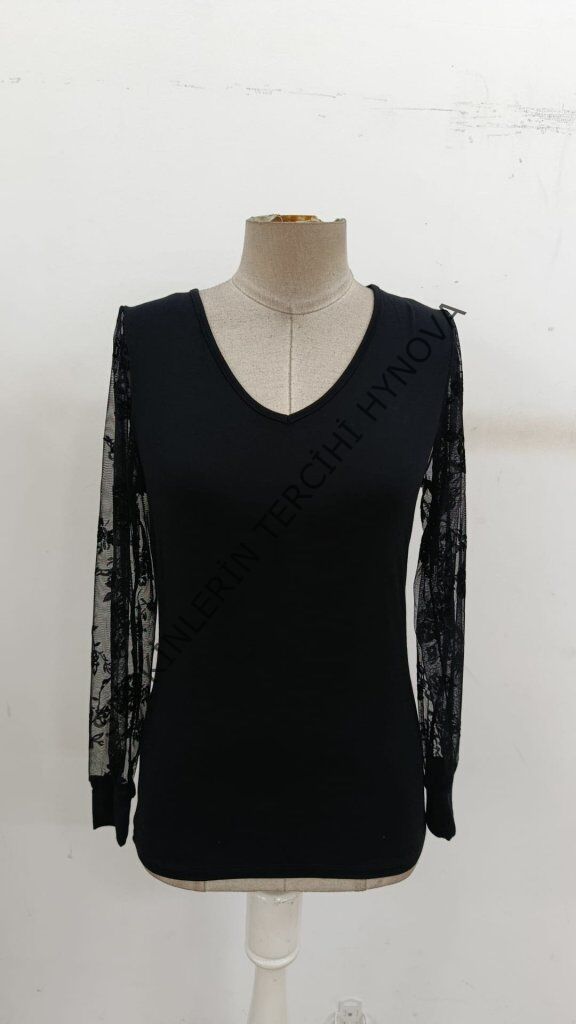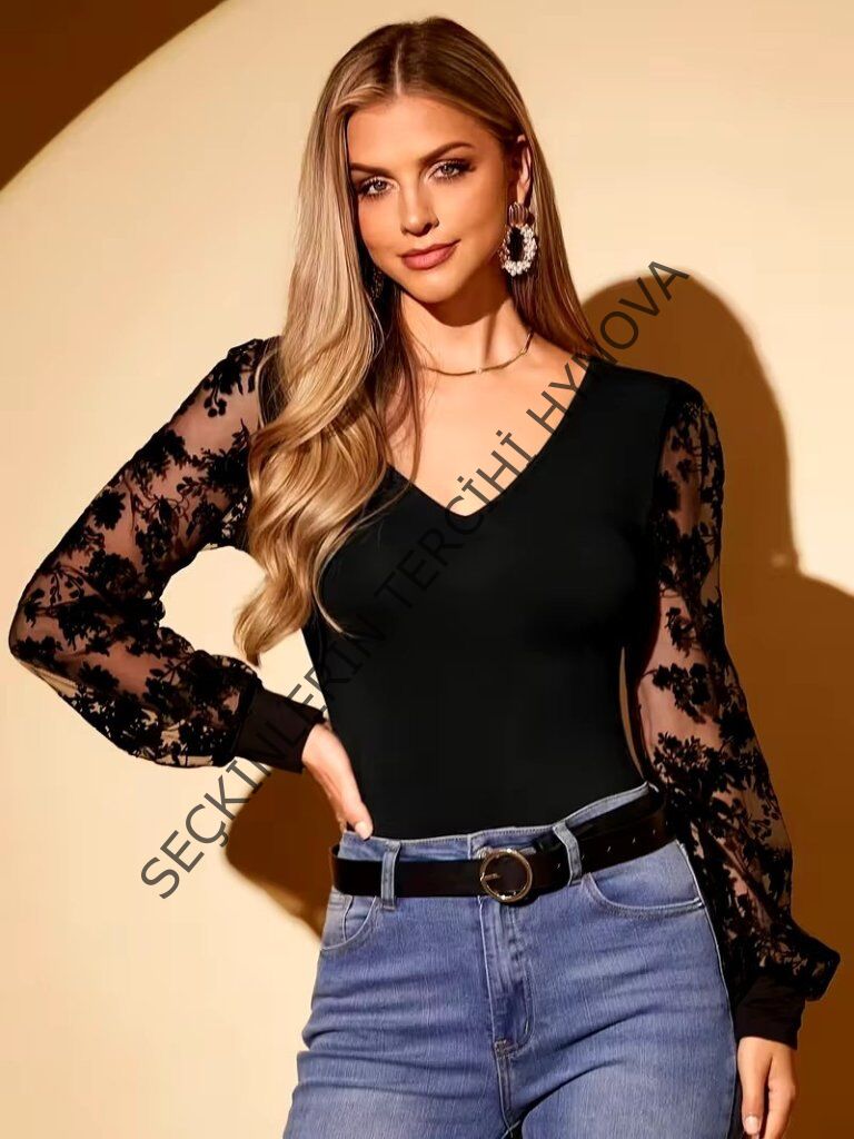 Kadın Uzun Kollu V Yakalı Dantelli Viskon Bluz