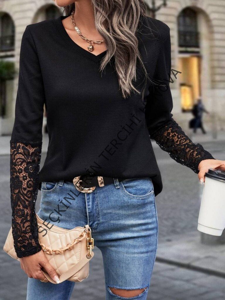 Kadın Uzun Kollu V Yakalı Dantelli Waffle Bluz