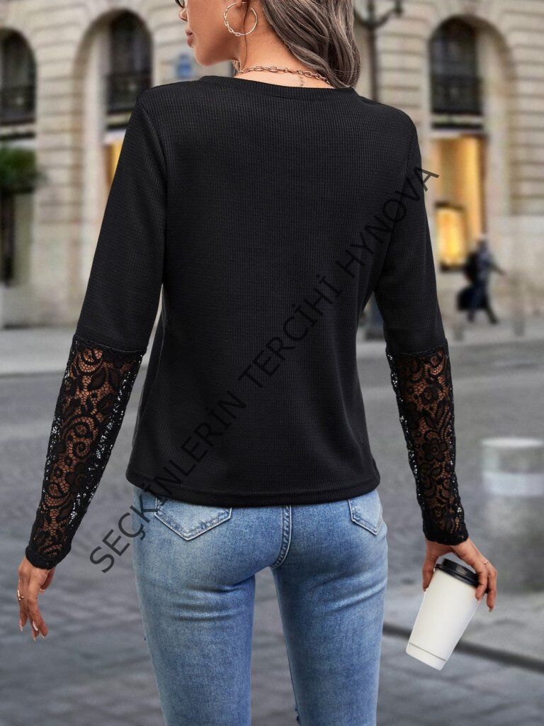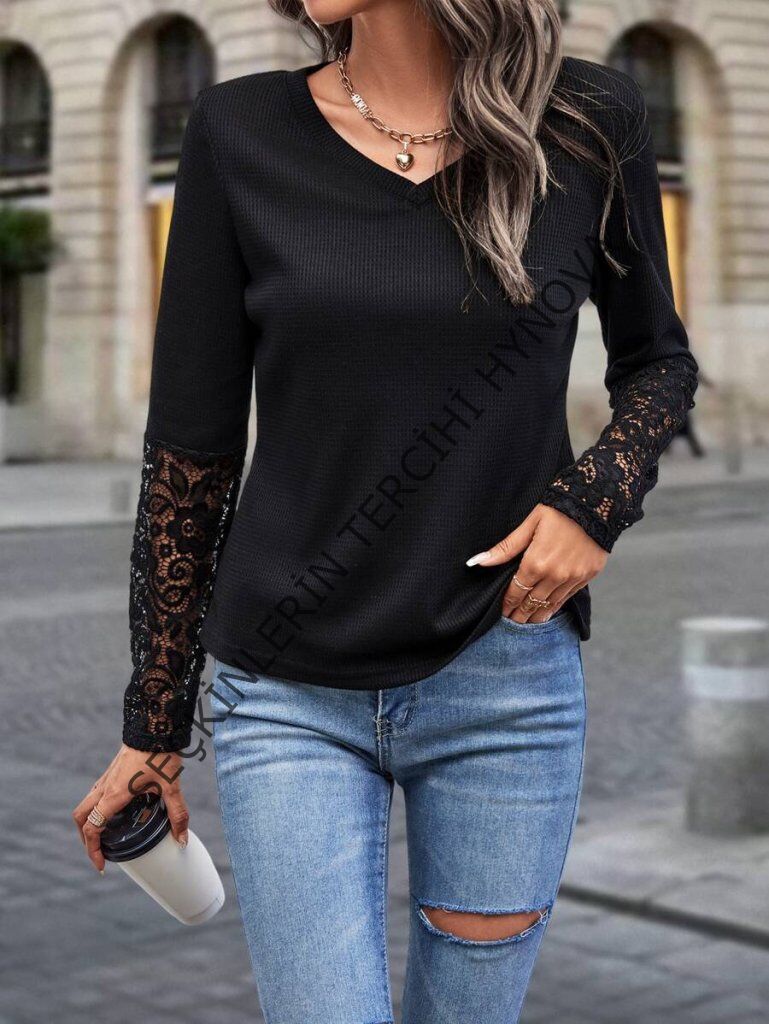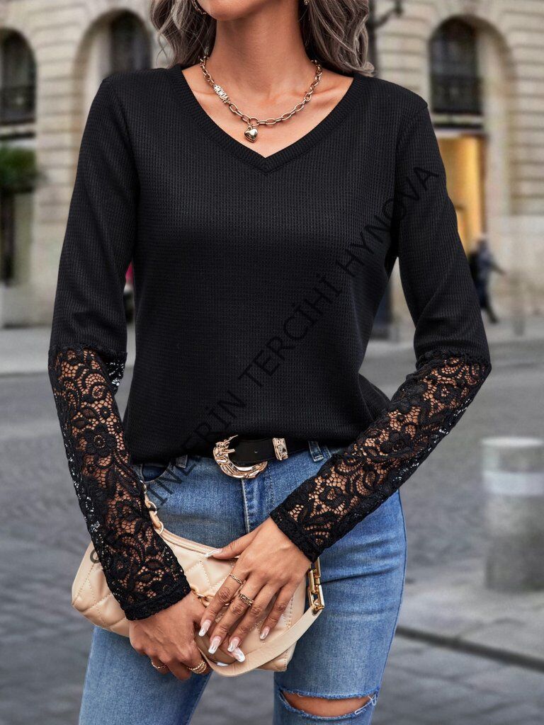 Kadın Uzun Kollu V Yakalı Dantelli Waffle Bluz