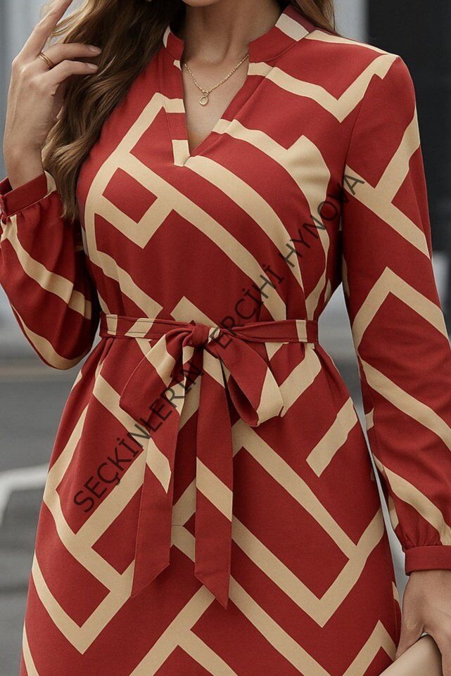 Kadın Uzun Kollu V Yakalı Desenli Belinde Kuşaklı Dalgıç Elbise
