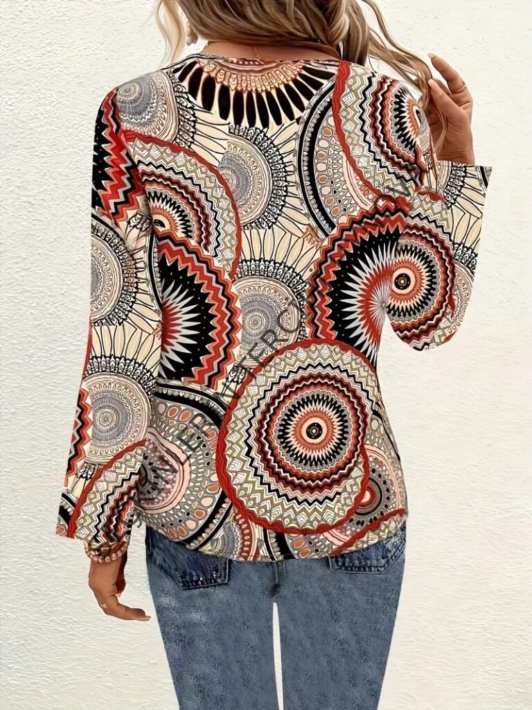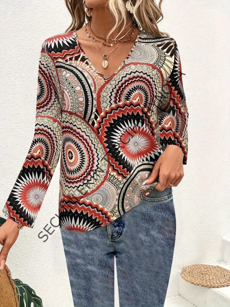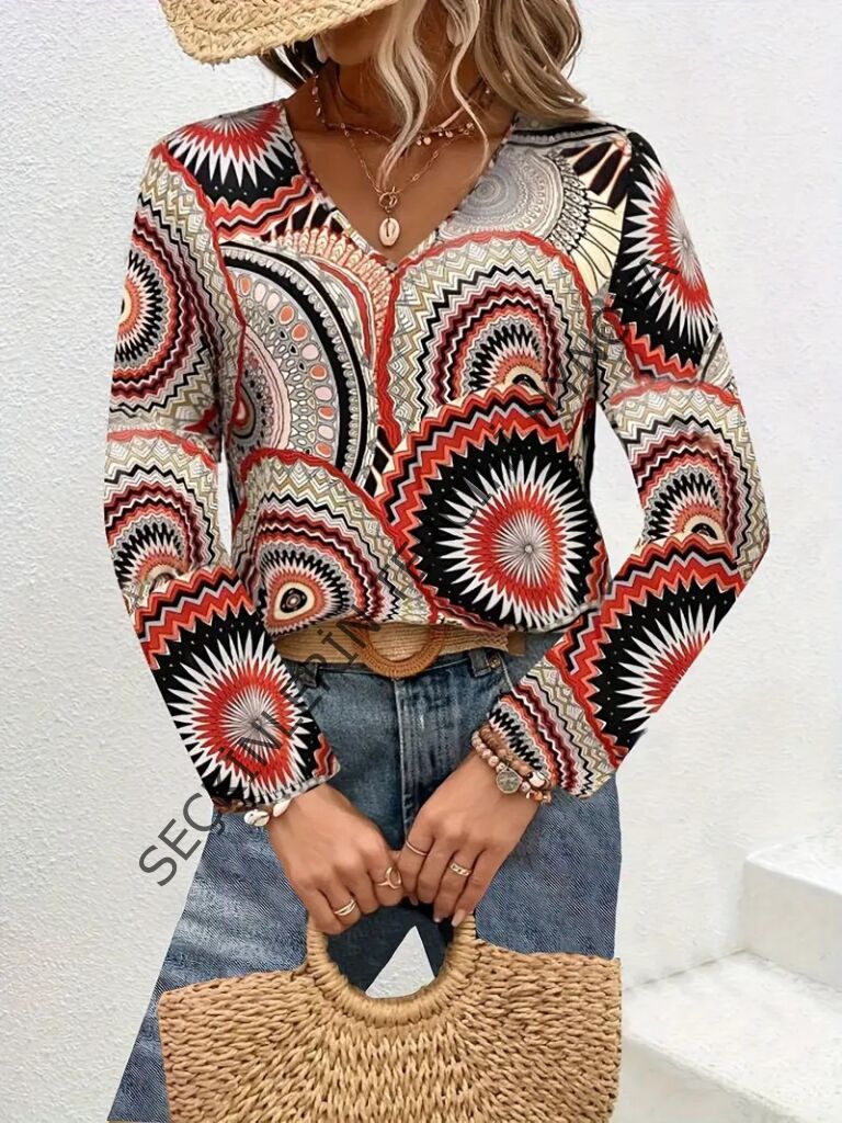 Kadın Uzun Kollu V Yakalı Desenli Süprem Bluz