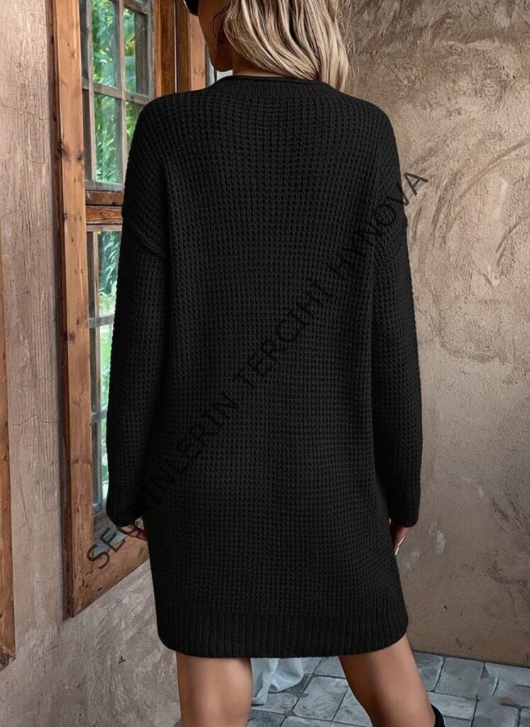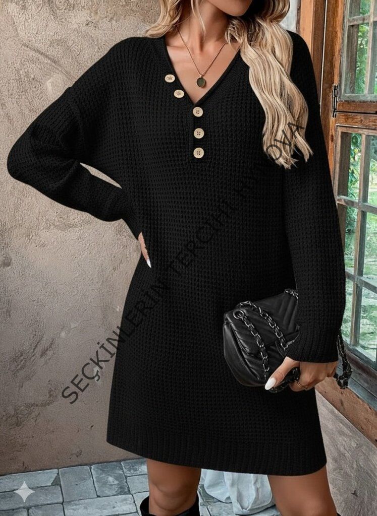 Kadın Uzun Kollu V Yakalı Düğmeli Mini Triko Elbise
