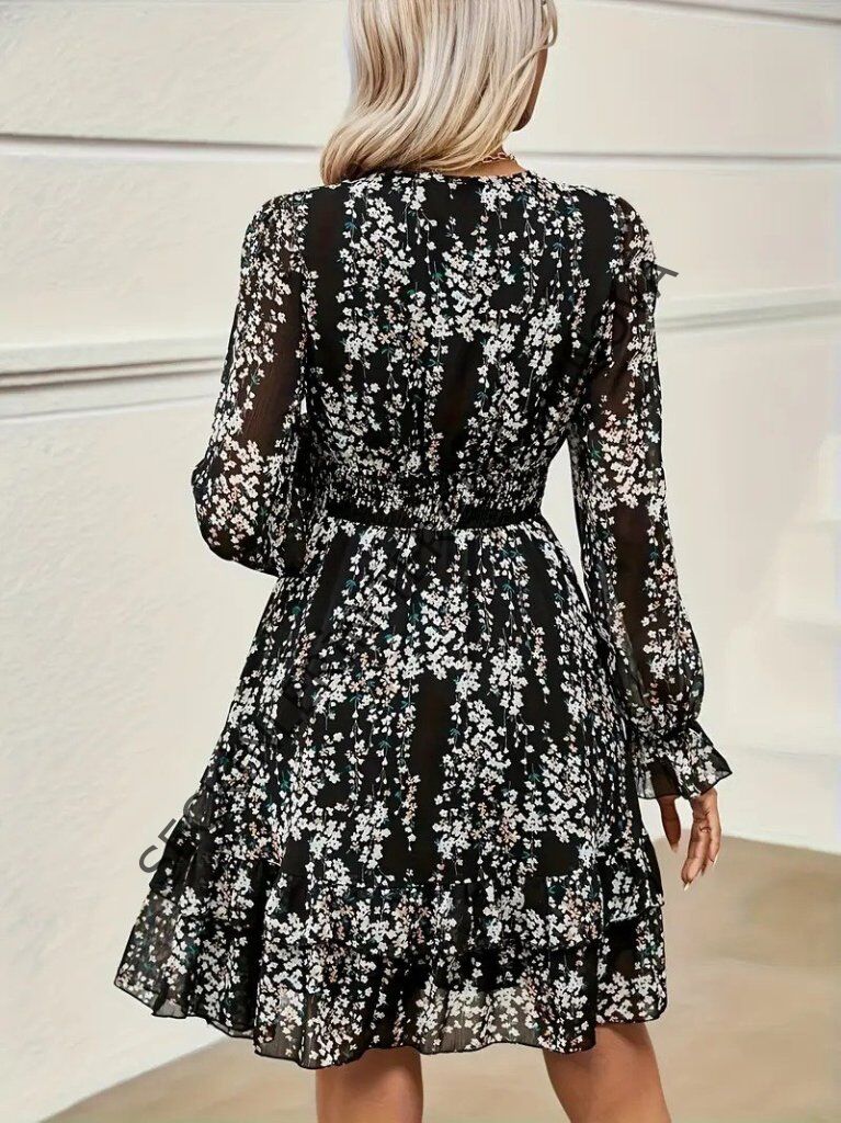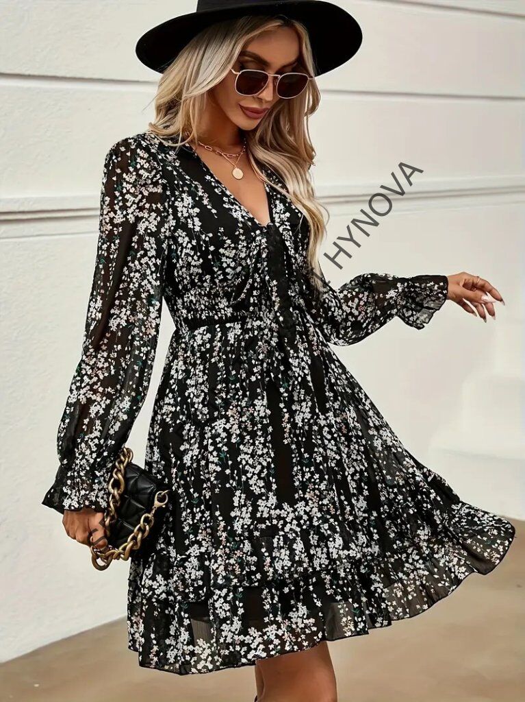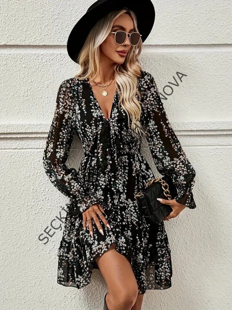 Kadın Uzun Kollu V Yakalı Fırfırlı Ve Bağcıklı şifon Mini Elbise