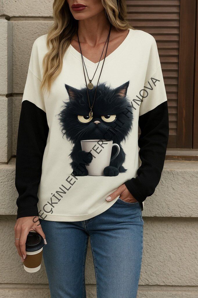 Kadın Uzun Kollu V Yakalı Kedi Baskılı şardonlu Dalgıç Bluz