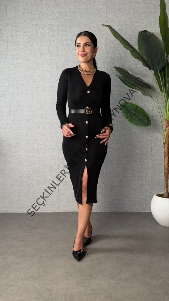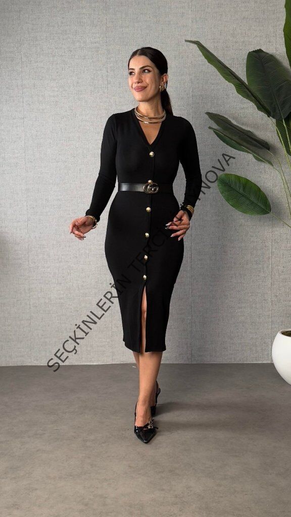 Kadın Uzun Kollu V Yakalı önden Düğmeli Yırtmaçlı Modal Midi Kemersiz Elbise