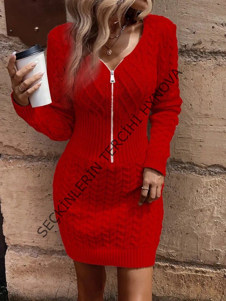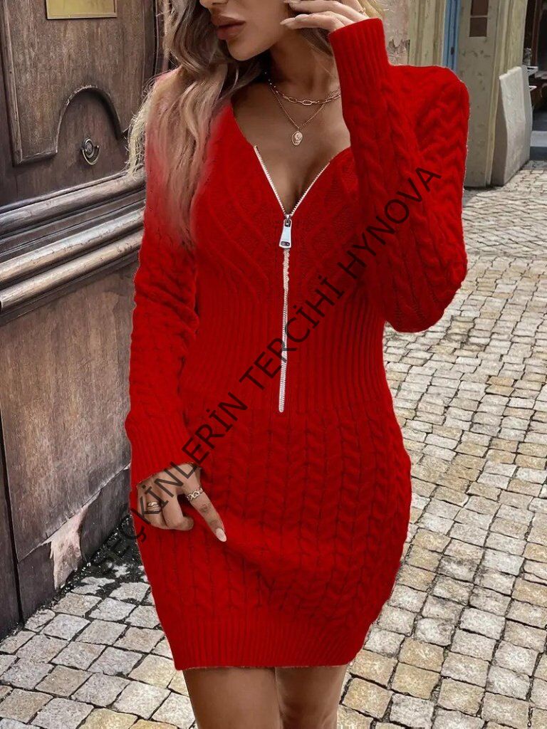 Kadın Uzun Kollu V Yakalı önden Fermuarlı Kısa Triko Elbise