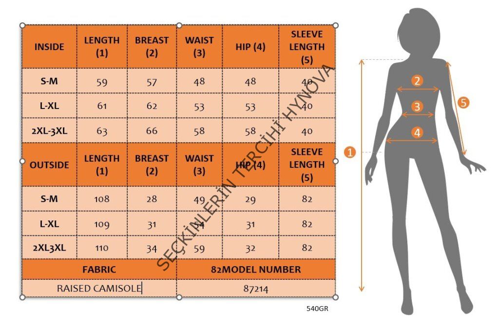 Modelin Ölçüleri: Boy:165, Kg:55, Göğüs:90, Bel:72, Kalça: 100