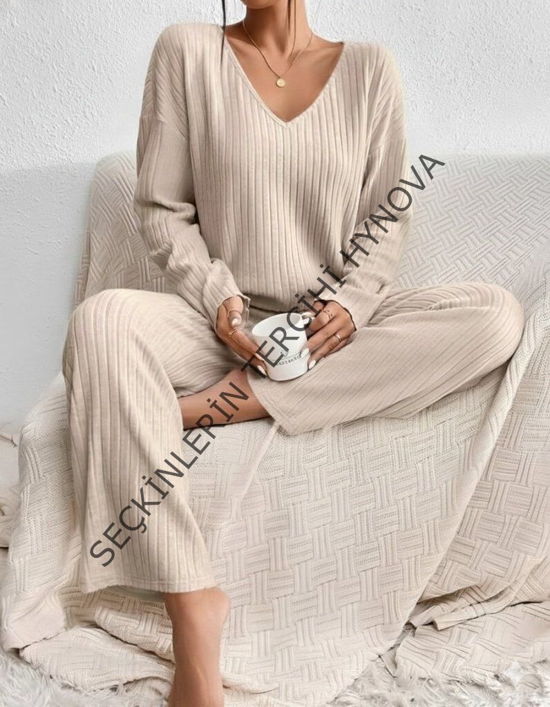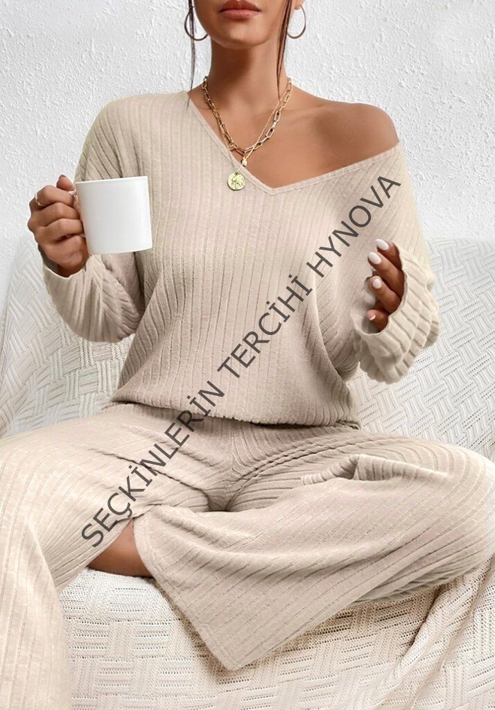 Kadın Uzun Kollu V Yakalı şardonlu Kaşkorse Bluz Ve Pantolon Ikili Takım
