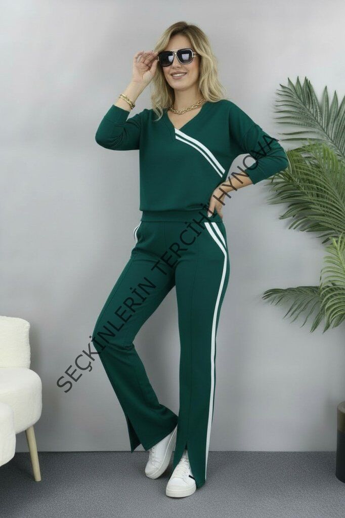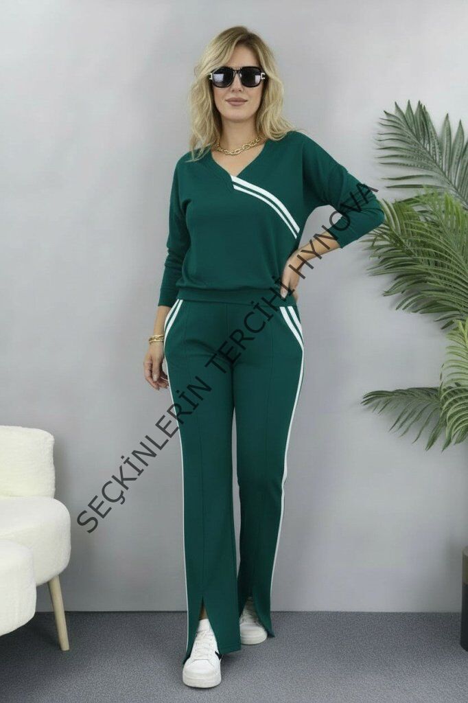 Kadın Uzun Kollu V Yakalı şerit Detaylı Viskon Iki Iplik Bluz Ve Pantolon Ikili Takım