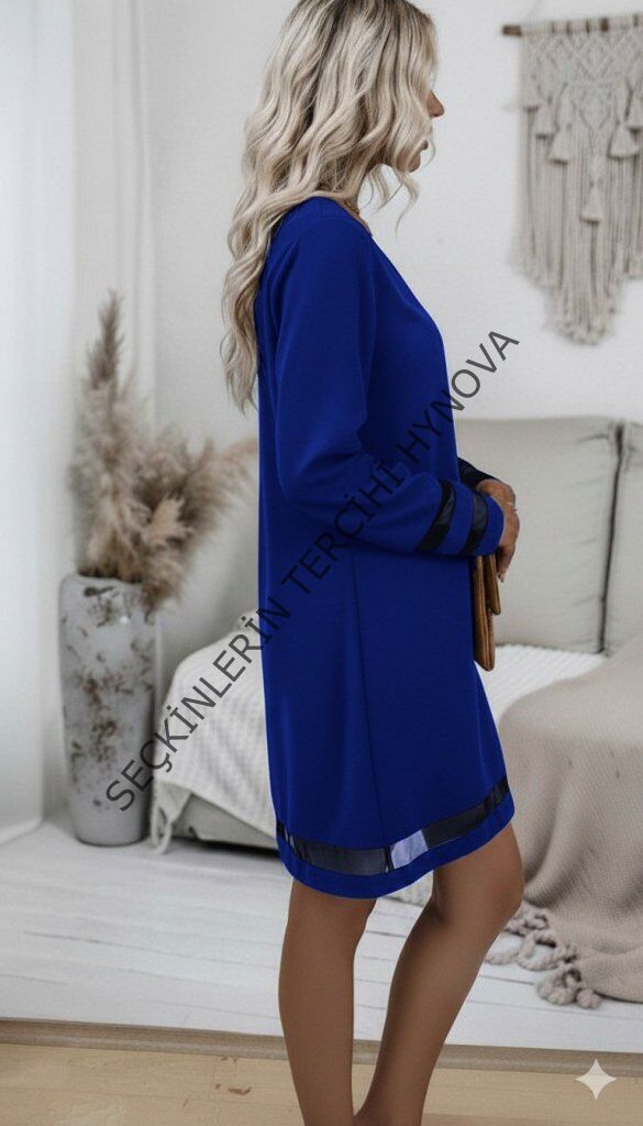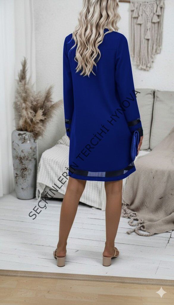 Kadın Uzun Kollu V Yakalı Tül şerit Detaylı Mini Krep Elbise