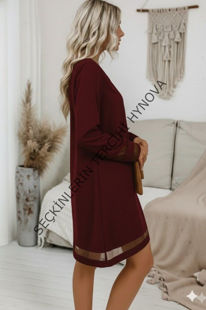 Kadın Uzun Kollu V Yakalı Tül şerit Detaylı Mini Krep Elbise