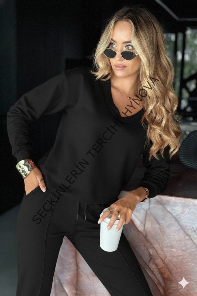 Kadın Uzun Kollu V Yakalı Viskon Iki Iplik Bluz Ve Pantolon Ikili Takım