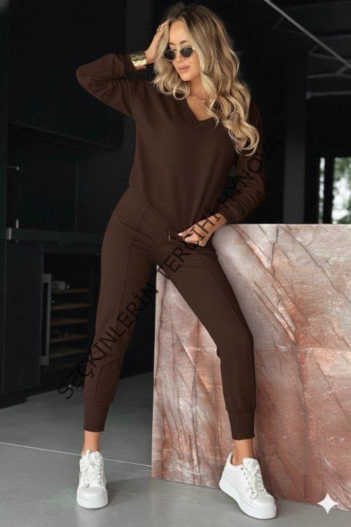 Kadın Uzun Kollu V Yakalı Viskon Iki Iplik Bluz Ve Pantolon Ikili Takım