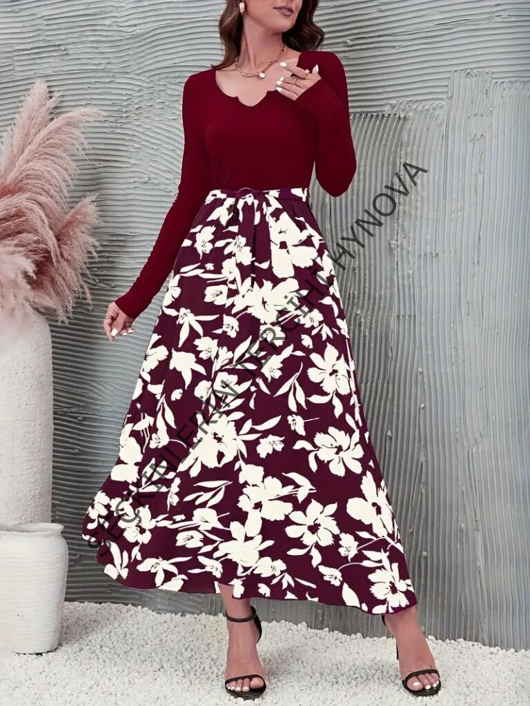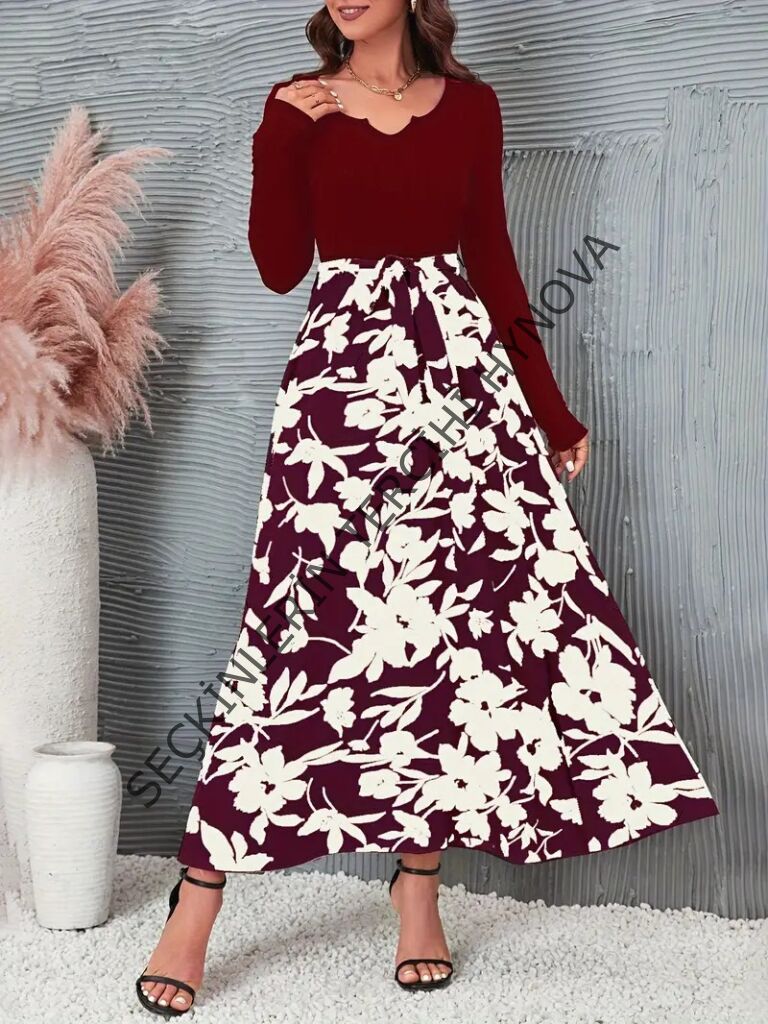 Kadın Uzun Kollu Yaka Açık üst Kaşkorse Beli Kuşaklı Alt çiçek Baskılı Dalgıç Elbise