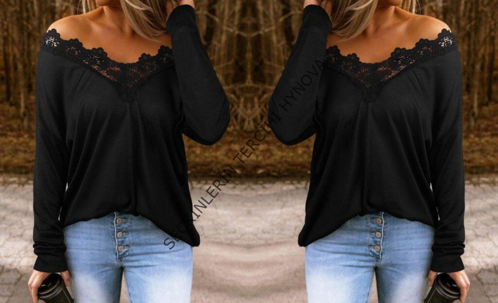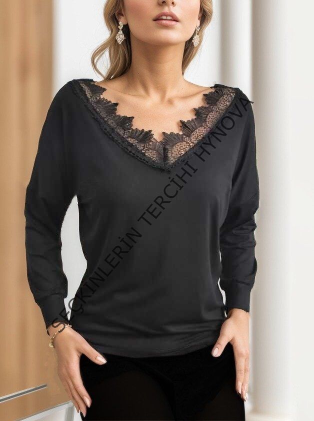 Kadın Uzun Kollu Yaka Güpür Detay Viskon Bluz