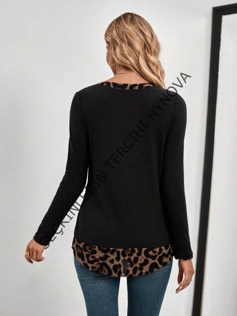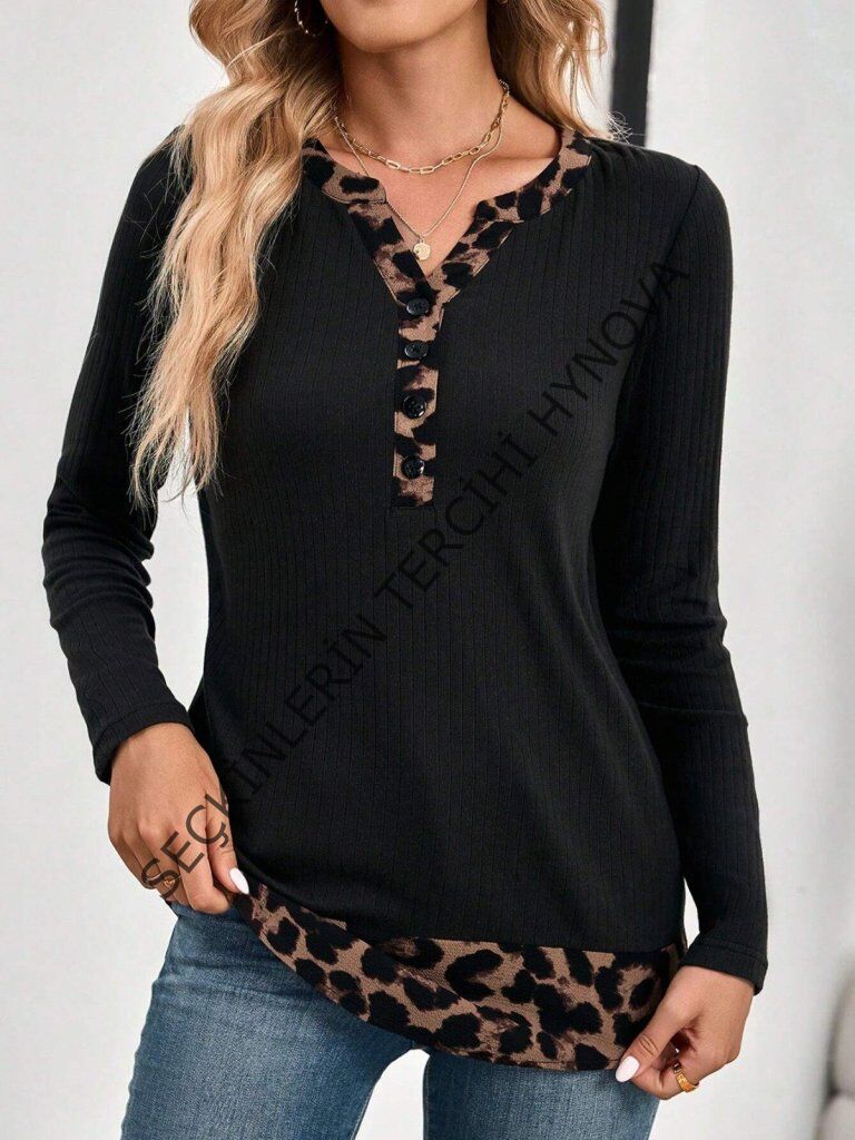 Kadın Uzun Kollu Yakadan Düğmeli Leopar Detaylı Kaşkorse Bluz