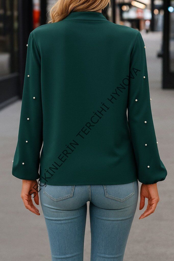 Kadın Uzun Kollu Yakadan Fiyonklu Incili Ithal Krep Bluz 173119
