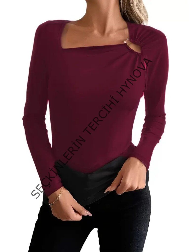 Kadın Uzun Kollu Yakadan Halka Detaylı Viskon Bluz