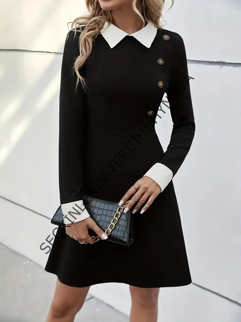Kadın Uzun Kollu Yakalı A Kesim Kısa Ithal Krep Elbise