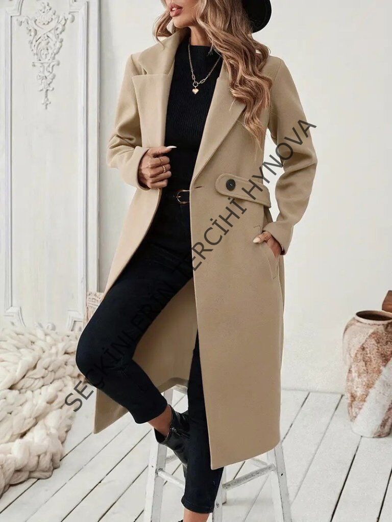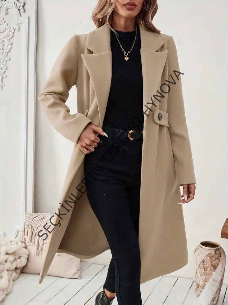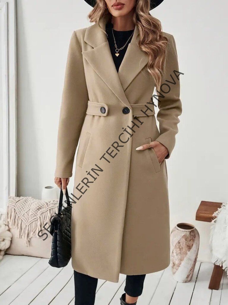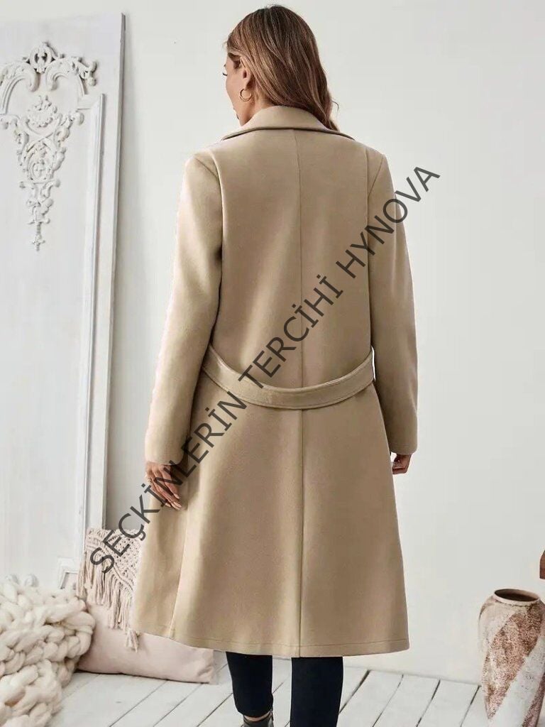 Kadın Uzun Kollu Yakalı Belde şerit Düğme Detaylı Cepli Mini Kaşe Kaban