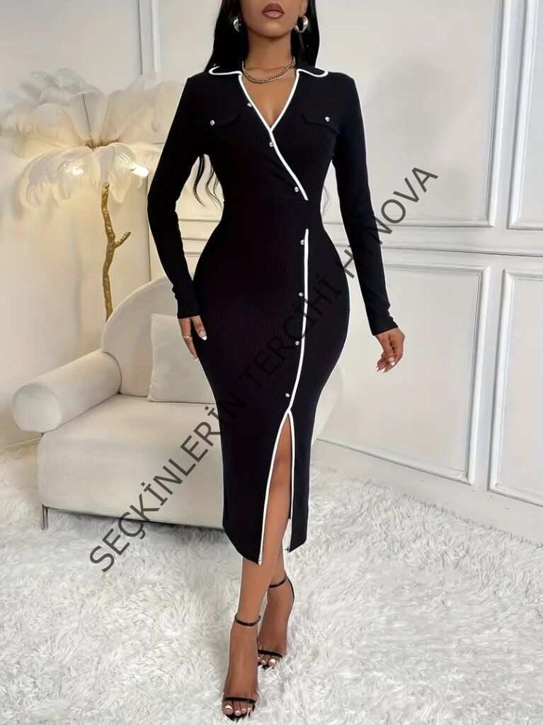 Kadın Uzun Kollu Yakalı Cepli Düğmeli Yırtmaç Detaylı Modal Uzun Elbise
