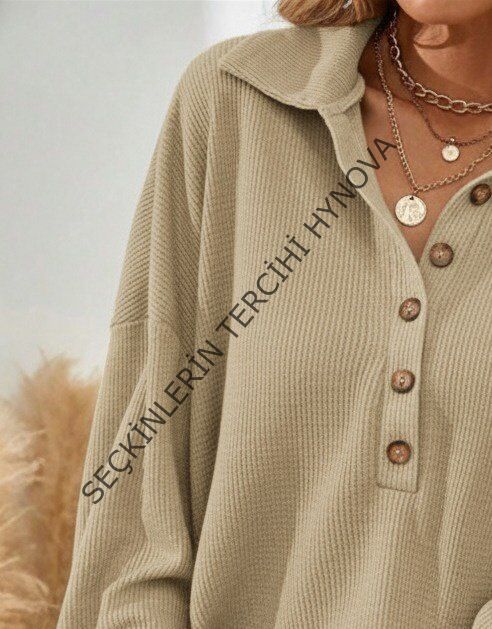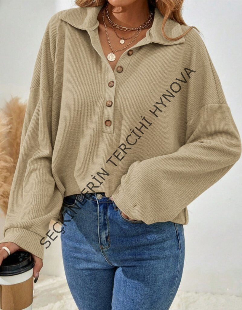 Kadın Uzun Kollu Yakalı Düğmeli Salaş Waffle Bluz