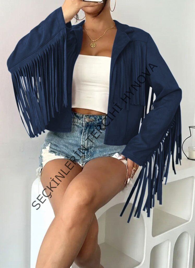Kadın Uzun Kollu Yakalı Kısa Püsküllü Süet Ceket