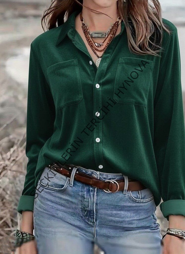 Kadın Uzun Kollu Yakalı önden Düğmeli Cep Detaylı Kadife Gömlek