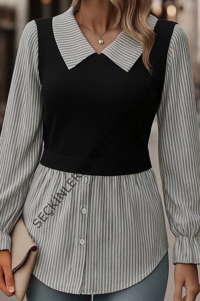 Kadın Uzun Kollu Yakalı önden Düğmeli Ottoman Bluz