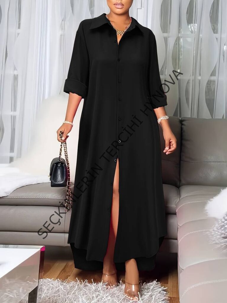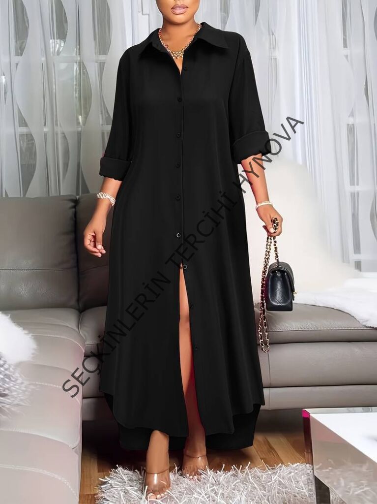 Kadın Uzun Kollu Yakalı önden Düğmeli Uzun Dokuma Elbise