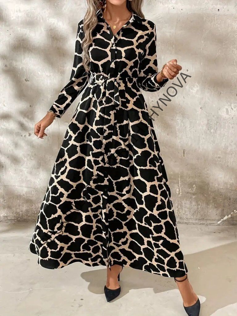 Kadın Uzun Kollu Yakalı önü Düğmeli Desenli Belden Kuşaklı Uzun Süprem Elbise