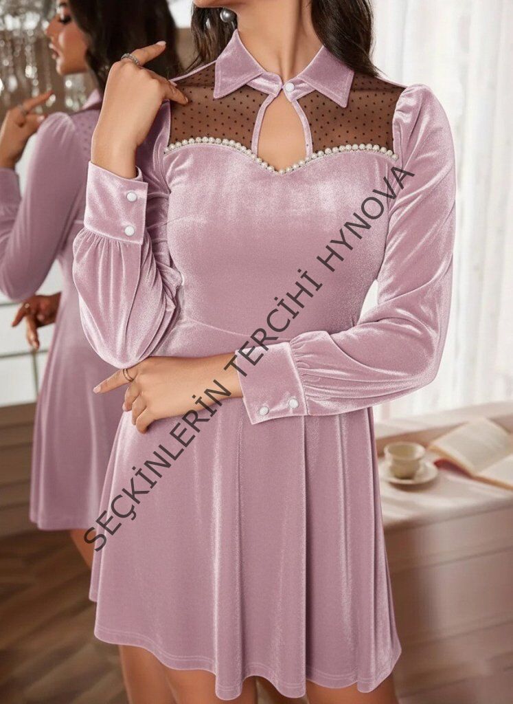Kadın Uzun Kollu Yakalı Tül Detaylı Incili Mini Kadife Elbise