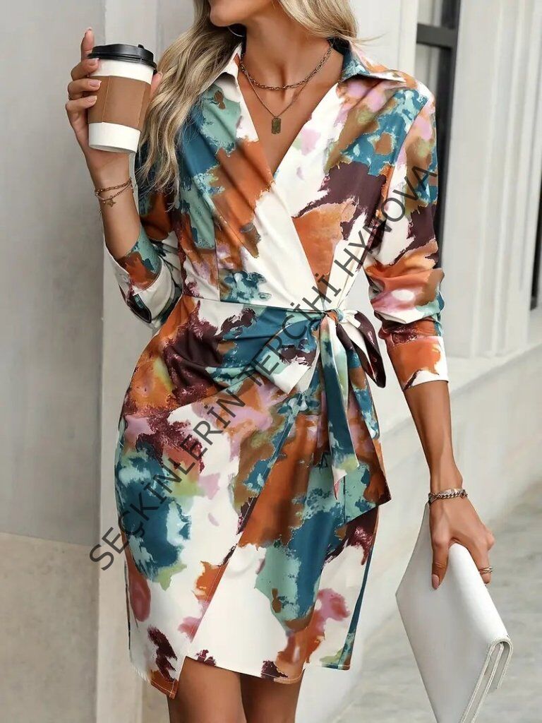 Kadın Uzun Kollu Yakalı Yandan Bağlamalı Mini Desenli Modal Elbise