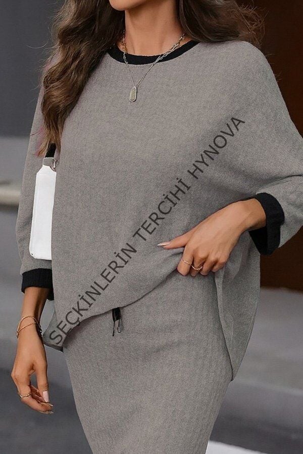 Kadın Uzun Kollu Yakası Açık şardonlu Kaşkorse Bluz Ve Eteği Bağcıklı Ikili Takım