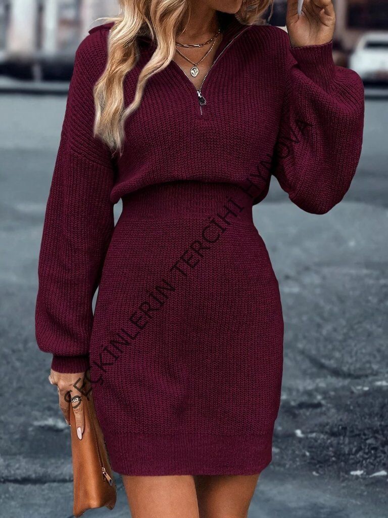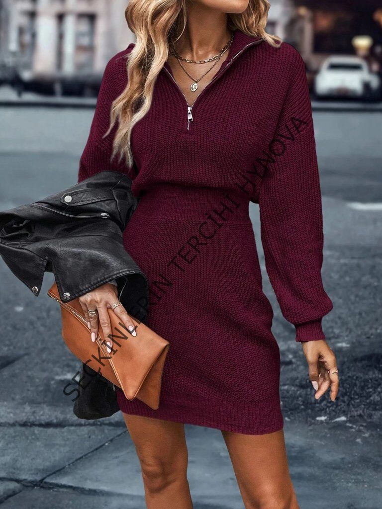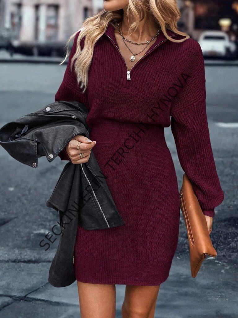 Kadın Uzun Kollu Yakası Fermuarlı Mini Triko Elbise