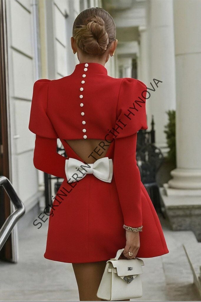 Kadın Uzun Kollu Yarı Balıkçı Yaka Arkadan Kurdela Detaylı Mini Atlas Elbise